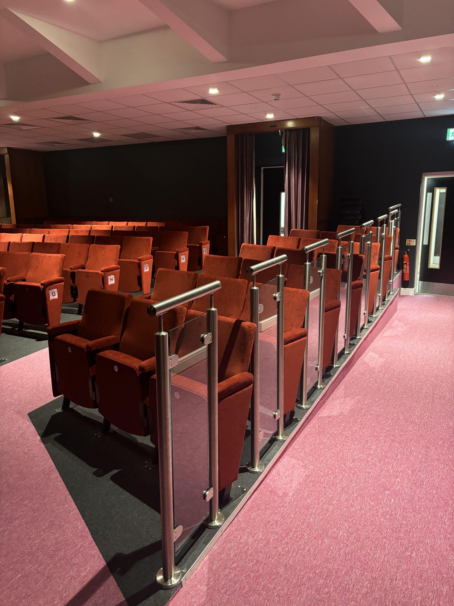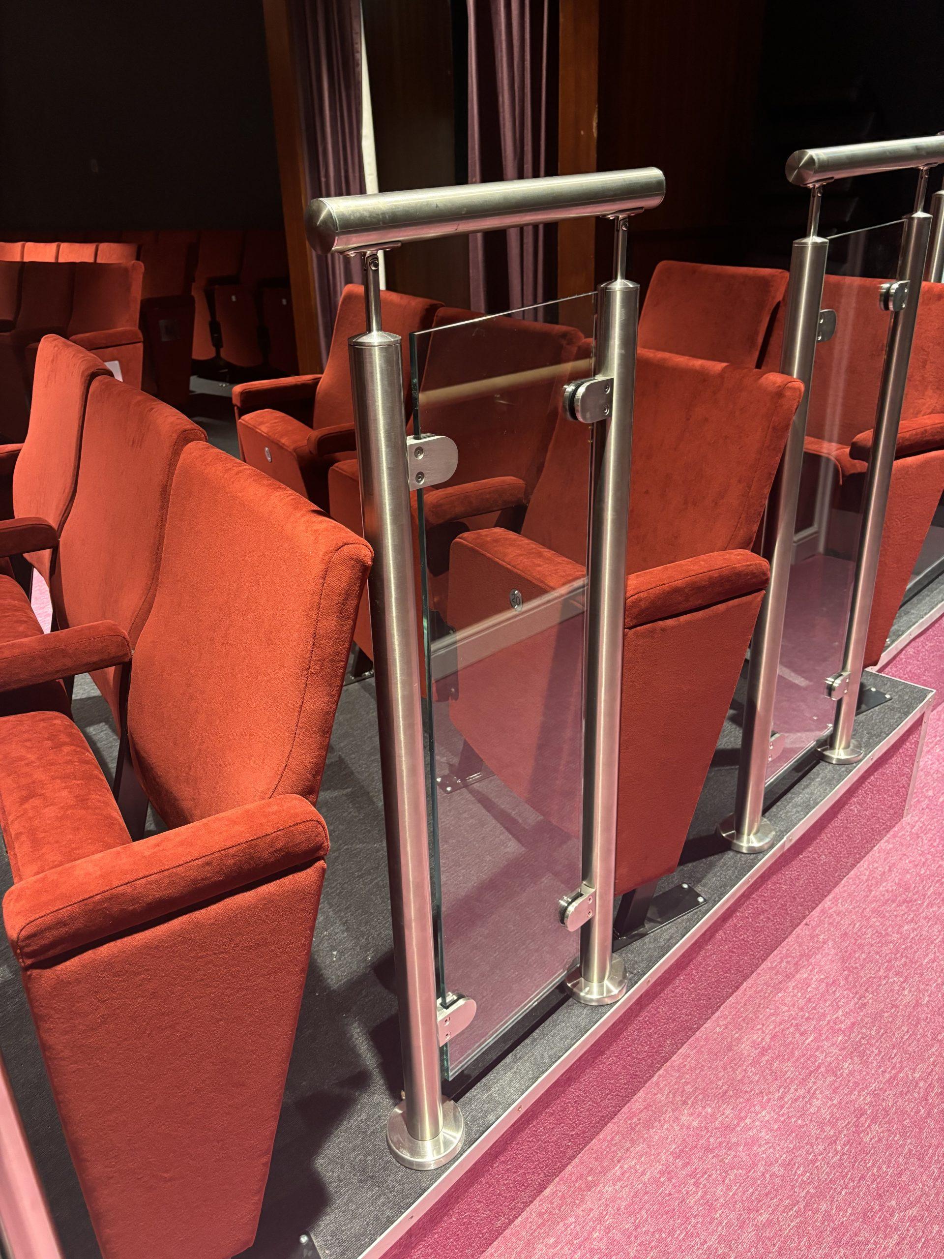 The theatre was fitted with a traditional oak mopstick wall rail and stainless steel balustrades with glass infills around the seating areas, combining safety with clear sightlines and a refined look.